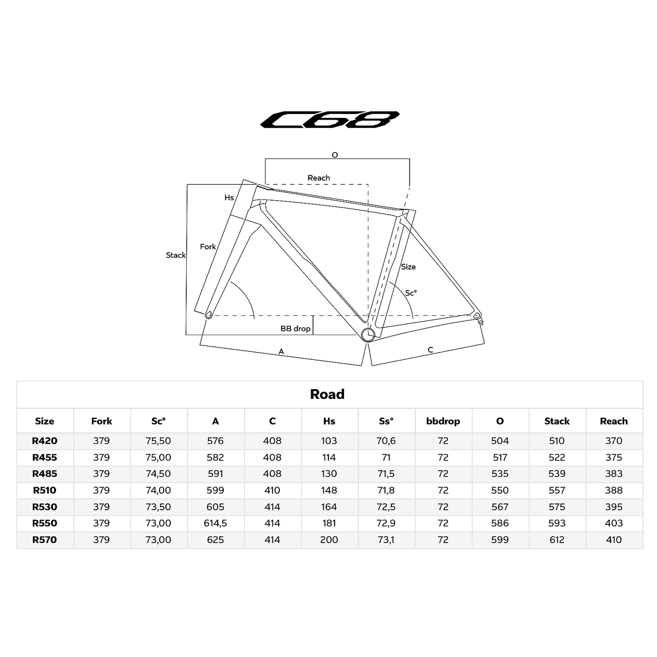 Агрессивная геометрияГеометрия шоссейного велосипеда C68 также делает его подходящим для тех, кто ценит скорость и более аэродинамичные посадки. Вылет, стек, угол наклона рулевой колонки и другие параметры сопоставимы с показателями гоночного велосипеда Colnago V4R.